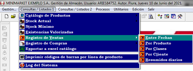 de Ventas (entre fechas, por producto, por clases, por cliente, resumidos diarios).