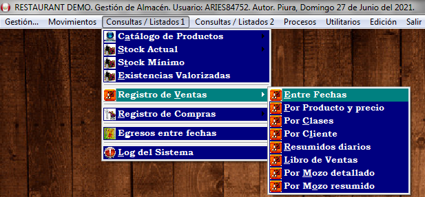 de Ventas (entre fechas, por producto y precio, por clases, por cliente, resumidos diarios, libro de ventas, por mozo detallado y resumidos).