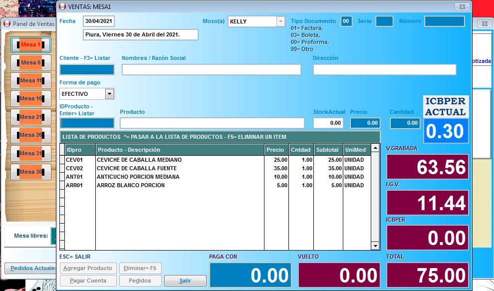 de Plataforma de Ventas con 40 Mesas. (Efectivo, Visa, Mastercard)