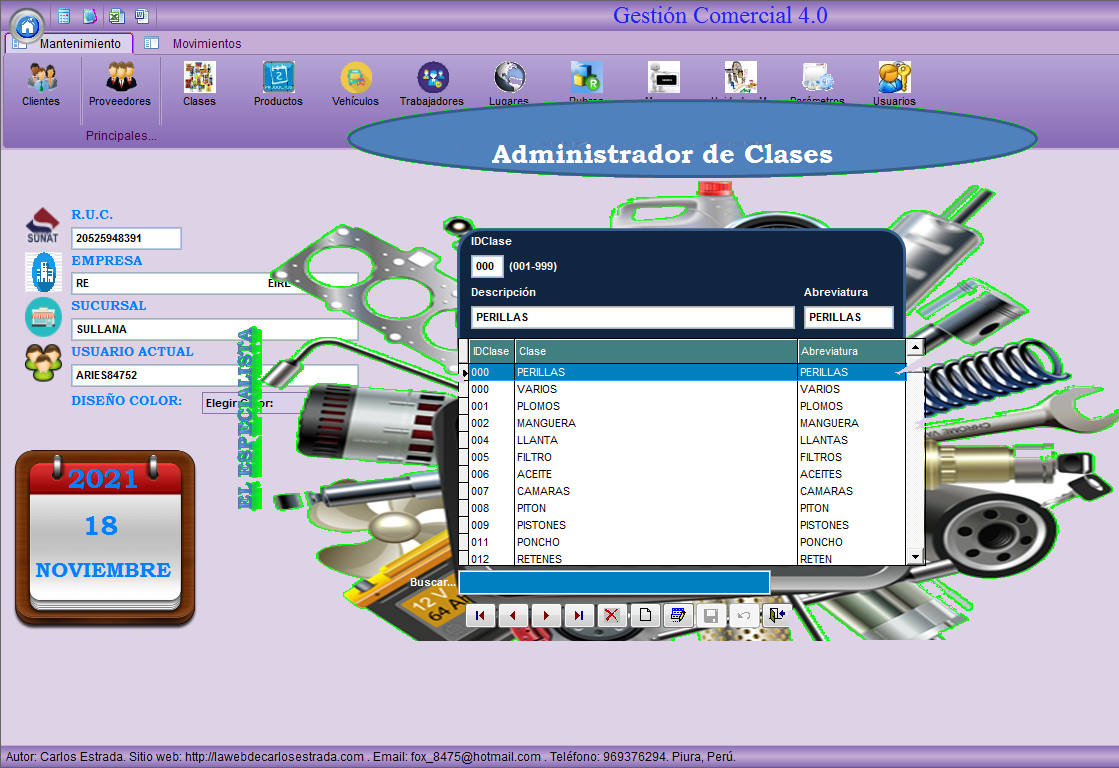 especialmente para satisfacer plena y sencillamente los requerimientos de las tiendas de repuestos automotrices, permite llevar un control de : Stock, Ventas y Compras al contado y al crédito, Clientes, Proveedores, Cuentas por cobrar, Cuentas por pagar, Guías de remisión, Transferencias entre almacenes, Actualización de precios, Cotizaciones, y mucho mas.